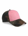 Unstructured, six-panel cap with a distressed frayed look has a touch of feminine pink.